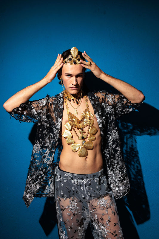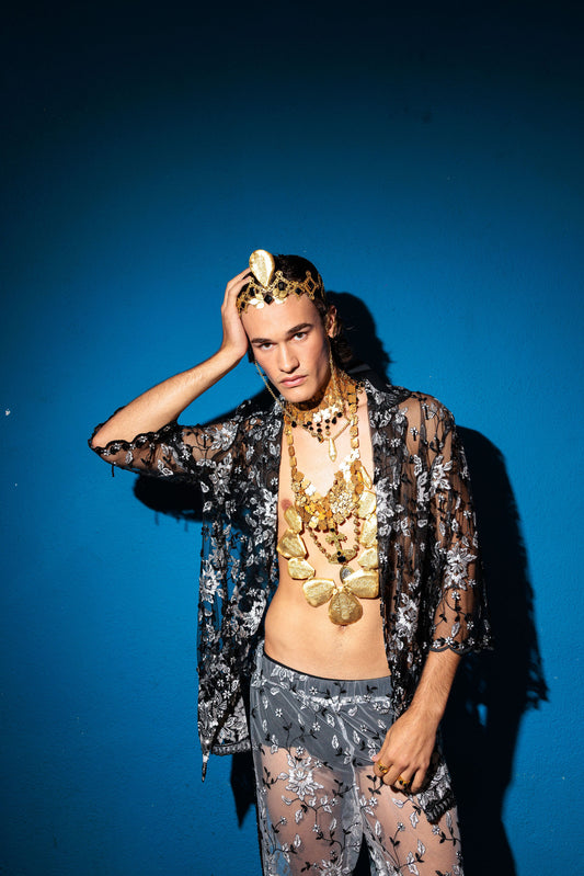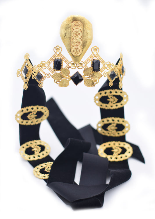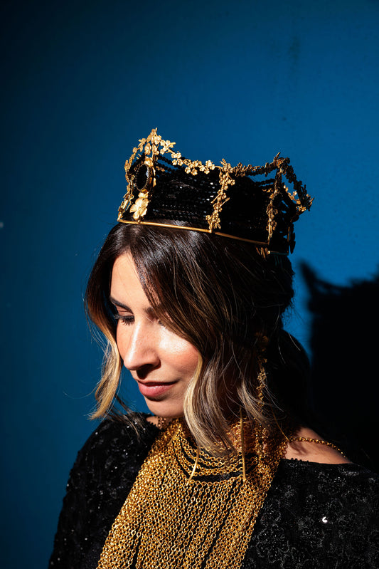 No nosso atelier desenhamos coroas, tiaras, toucados, bandoletes, brincos, pulseiras de mão e braço, pulseiras tradicionais, anéis, tops, saias, casacos... Tudo! Desenhamos e produzimos cada peça à sua medida.