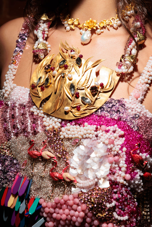 No nosso atelier desenhamos coroas, tiaras, toucados, bandoletes, brincos, pulseiras de mão e braço, pulseiras tradicionais, anéis, tops, saias, casacos... Tudo! Desenhamos e produzimos cada peça à sua medida.