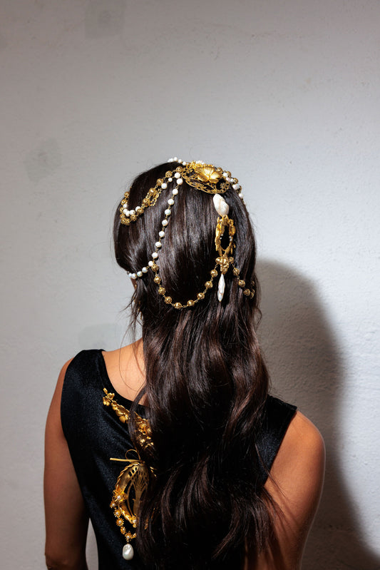 In our studio we design crowns, tiaras, headdresses, headbands, earrings, hand and arm bracelets, traditional bracelets, rings, tops, skirts, coats... Everything! We design and produce each piece to your specifications.