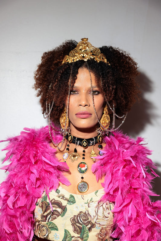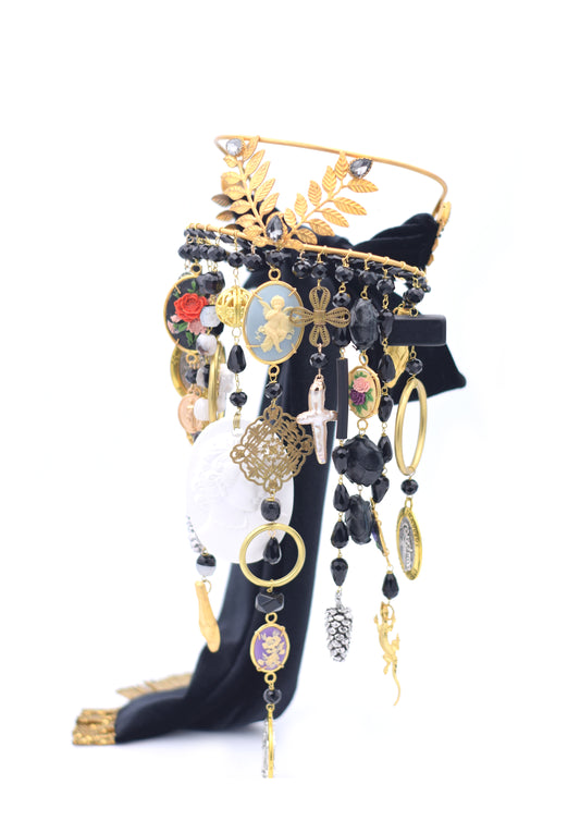 In our studio we design crowns, tiaras, headdresses, headbands, earrings, hand and arm bracelets, traditional bracelets, rings, tops, skirts, coats... Everything! We design and produce each piece to your specifications.