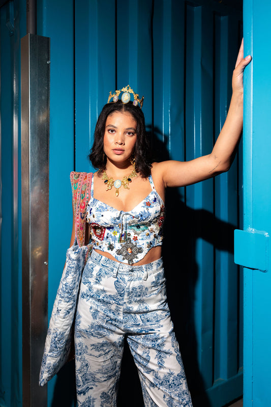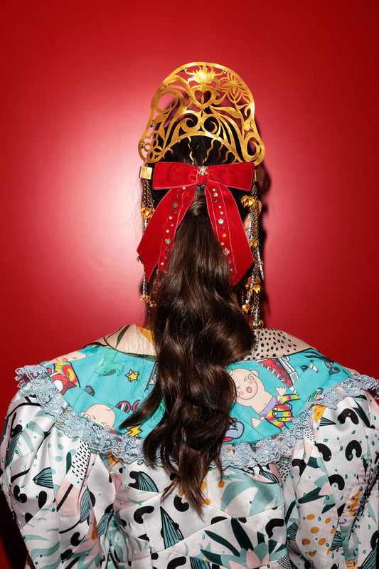 In our studio we design crowns, tiaras, headdresses, headbands, earrings, hand and arm bracelets, traditional bracelets, rings, tops, skirts, coats... Everything! We design and produce each piece to your specifications.