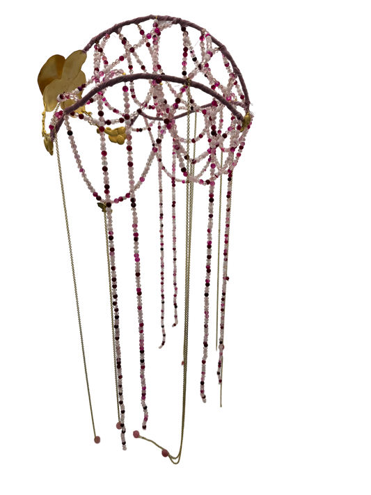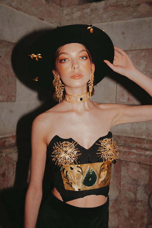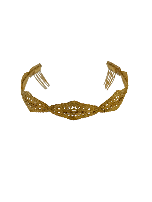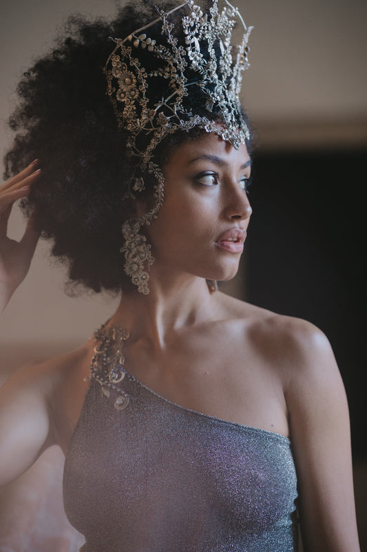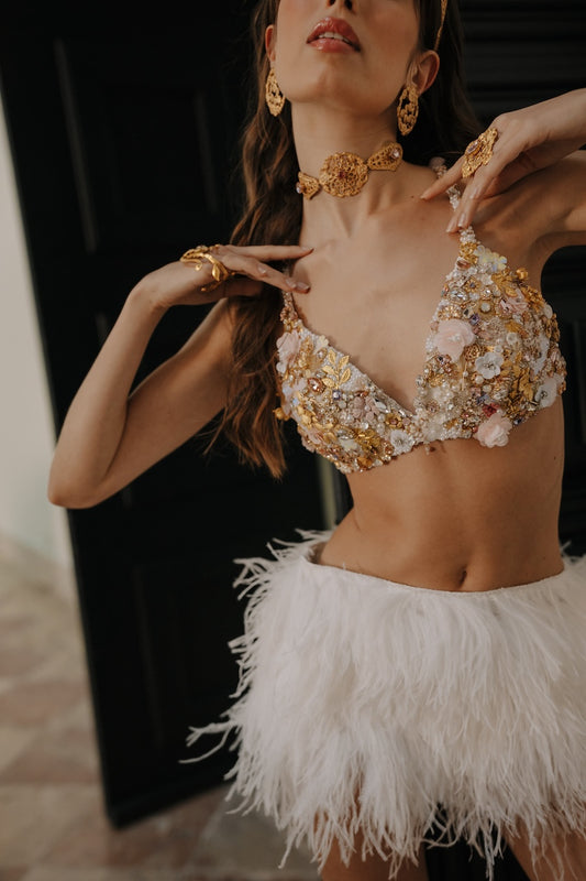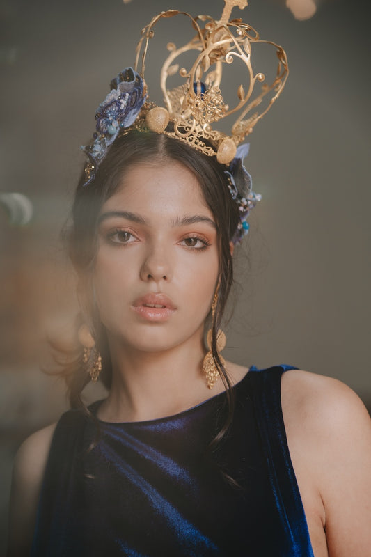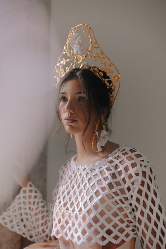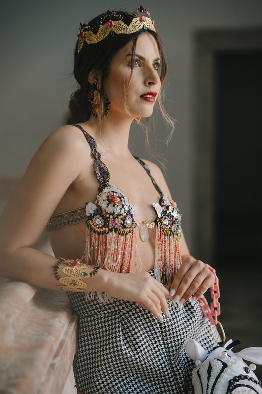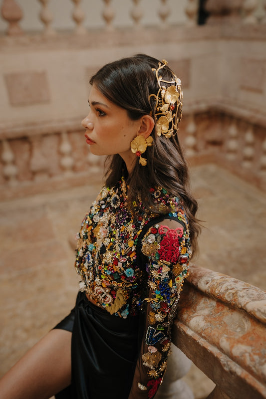 In our studio we design crowns, tiaras, headdresses, headbands, earrings, hand and arm bracelets, traditional bracelets, rings, tops, skirts, coats... Everything! We design and produce each piece to your specifications.