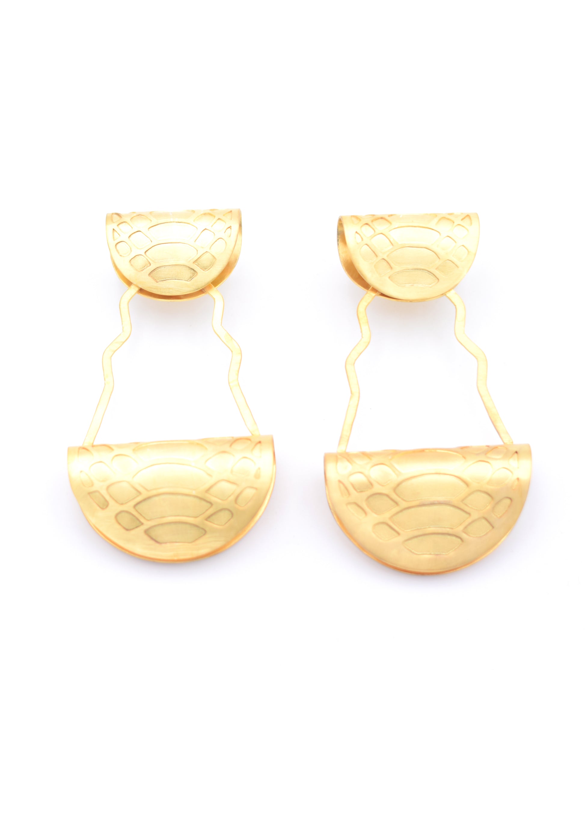 Our earrings are made of brass, gold plated and are sold as a pair. The earring does not hold through holes.
