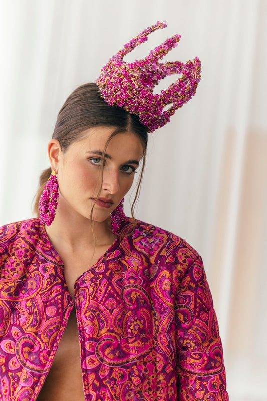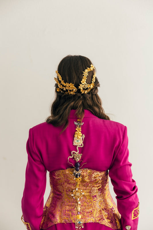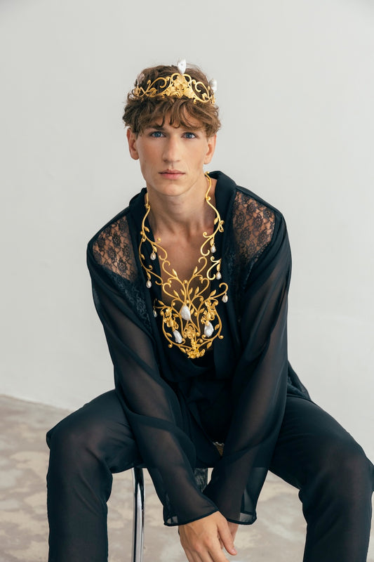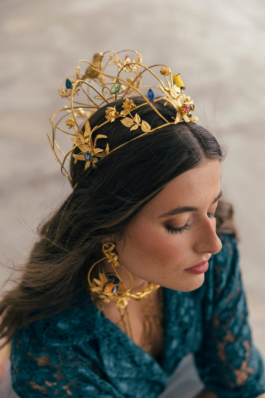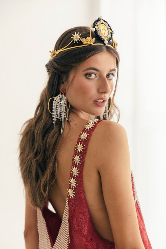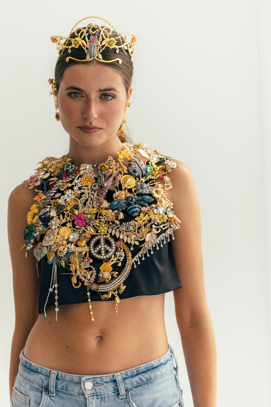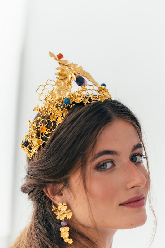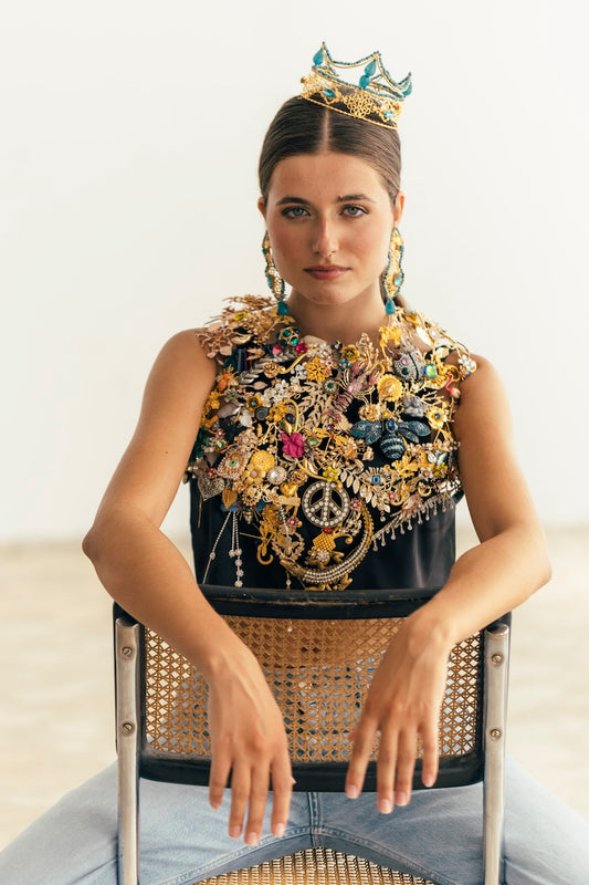 En nuestro estudio diseñamos coronas, tiaras, tocados, diademas, pendientes, pulseras para manos y brazos, pulseras tradicionales, anillos, tops, faldas, abrigos… ¡Todo! Diseñamos y producimos cada pieza según tus especificaciones.